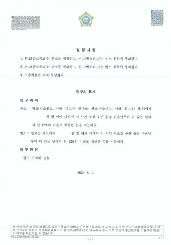 4. 결론적으로는 양 측 모두 소 취하 및 각 동의하는 내용으로 화해함으로써 의뢰인이 제1심의 반소패소로 인해 입은 경제적 불이익을 제거함