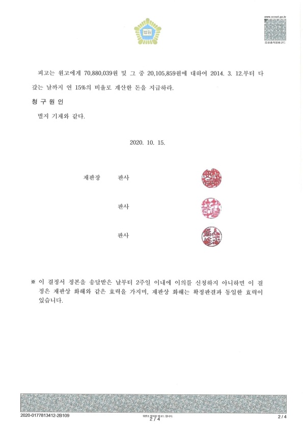 의뢰인이 연대보증인 명의로 되어 있는 채권을 전전 양수한 대부업체가, 과거 의뢰인을 상대로 7천만원 상당의 연대보증채무를 이행하라는 취지의 소송을 제기하였었고, 의뢰인은 소송 계속 사실을 알지 못해 다투지 못한 채 공시송달(문서를 송달받을 자의 주소를 알수 없어 법원 공고로 갈음한 송달)에 의하여 판결문이 송달된 이후 2주의 항소기간이 지나 제1심 판결이 그대로 확정되었었으며, 위 대부업체는 위 공시송달 판결확정 이후로도 수년이 지난 시점에 위 확정판결을 권원삼아 의뢰인에게 강제집행을 예고하는 내용증명 우편을 발송한 사안에서, 상담 및 사건수임 즉시 관할 고등법원에 적법한 추후 보완 사유를 상세히 적시한 추완항소(항소기간을 도과하였으나 항소인이 그 기간을 준수하지 못한 것에 대하여 항소인에게 취책을 물을 수 없는 경우에 제기하는 추후 보완 항소)장을 제출하여 항소심 심리가 개시되도록 한 다음, 기록 검토를 통하여 1) 의뢰인은 위 연대보증관련 계약을 체결한 사실이 없고 관련 증거의 진정을 인정할 수 없음, 2) 가사 계약체결 사실이 인정되더라도 위 대부업체의 최초 소 제기일은 소멸시효가 도과된 이후임, 3) 위 채권양도는 적법한 대항요건을 구비하지 못한 것임 등의 법률적 항변을 하였고, 이에 대부업체가 청구포기 취지의 답변을 제출하여 그 취지에 따른 화해권고결정 확정으로 관련 분쟁이 종국적으로 종지된 사례