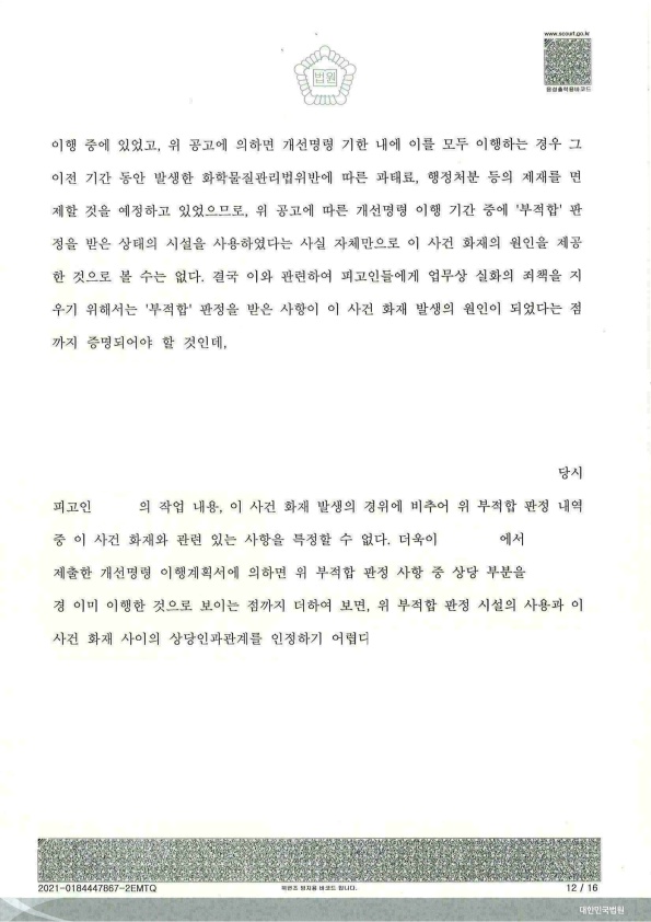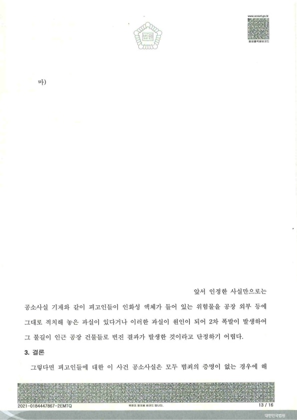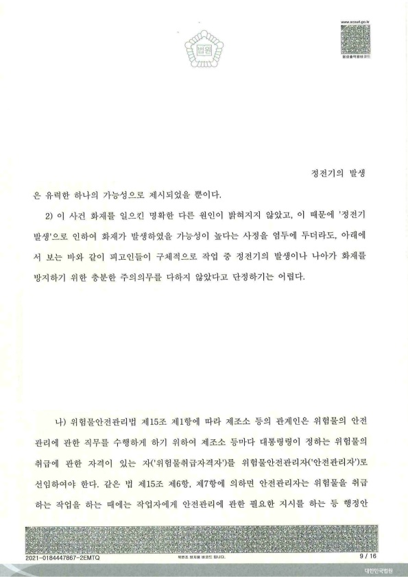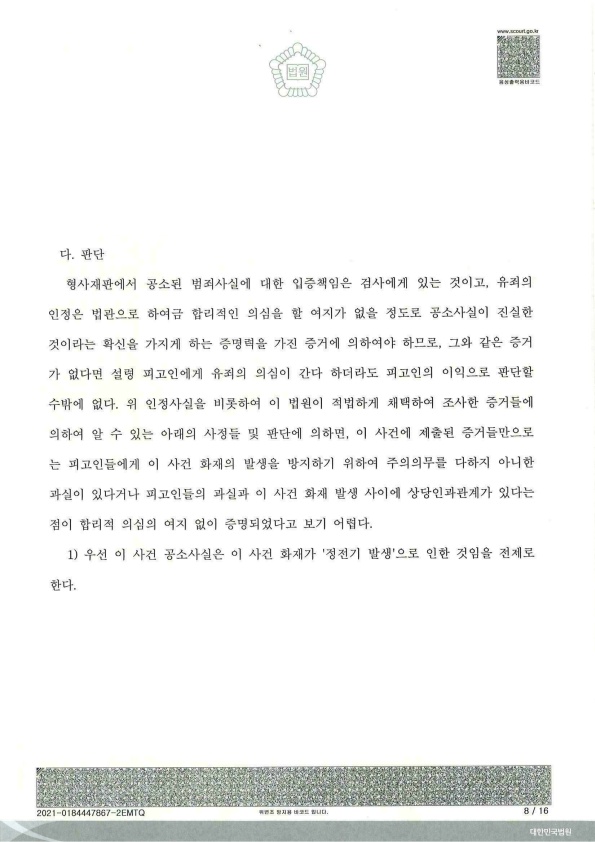 [형사] 대형 화재사건 관련 공장 근로자의 업무상실화죄(구형 1년 6개월) 무죄선고 사례