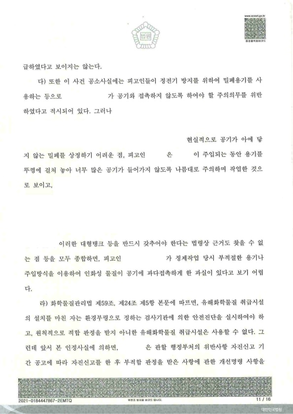 2. 검사가 제출한 공소사실 요지는, 의뢰인은 (다른 공동피고인들과 공동하여) ① 당시 관계당국으로부터 부적합 판정을 받은 화학물질 취급시설로 작업한 점, ② 안전관리자의 참여가 없이 작업한 점, ③ 정전기 방지의무를 준수하지 않은 채 작업한 점, ④ 작업 당시 부적절한 용기를 사용하였고 뚜껑을 닫지 않는 등 부주의했던 점, ⑤ 공장 내 · 외부에 폐기물 보관통을 위법하게 적치하여 둔 점 등의 업무상 주의의무 위반을 저질러, 정제시설 내에서 정전기로 인한 이 사건 화재를 최초 발생케 하고 외부 폐기물 보관통을 매개로 연소 · 확대되게 했다는 것임