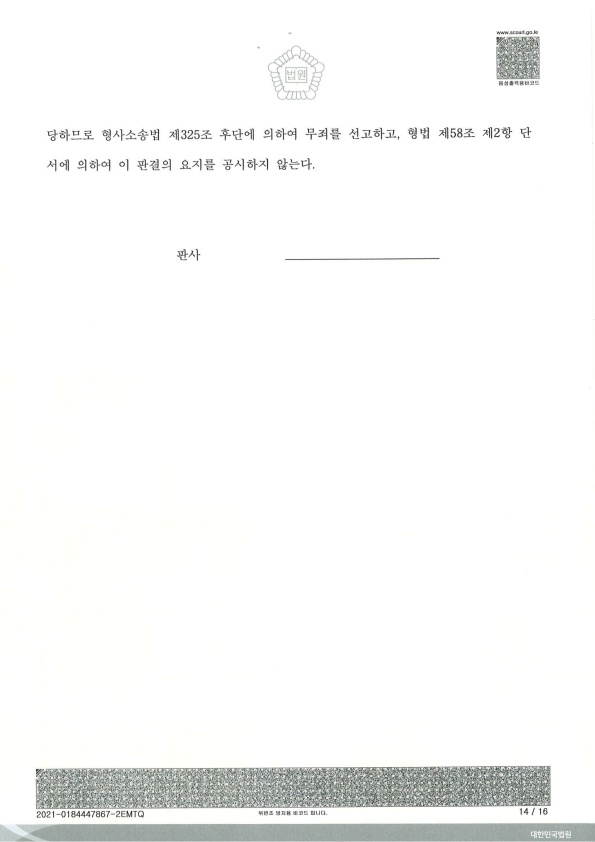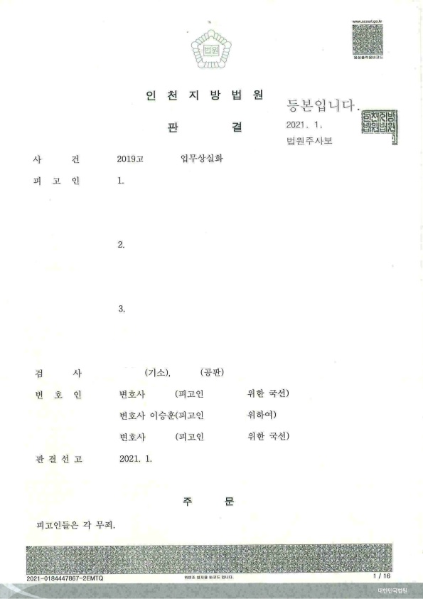 4. 법원은 본 변호사의 주장 대부분의 취지 그대로를 판결이유로 하여 공소사실 및 검사의 구형(1년 6개월)을 배척하였고, 동일 · 동종의 공소사실로 기소된 공동피고인들 모두에 대하여 각 무죄를 선고함