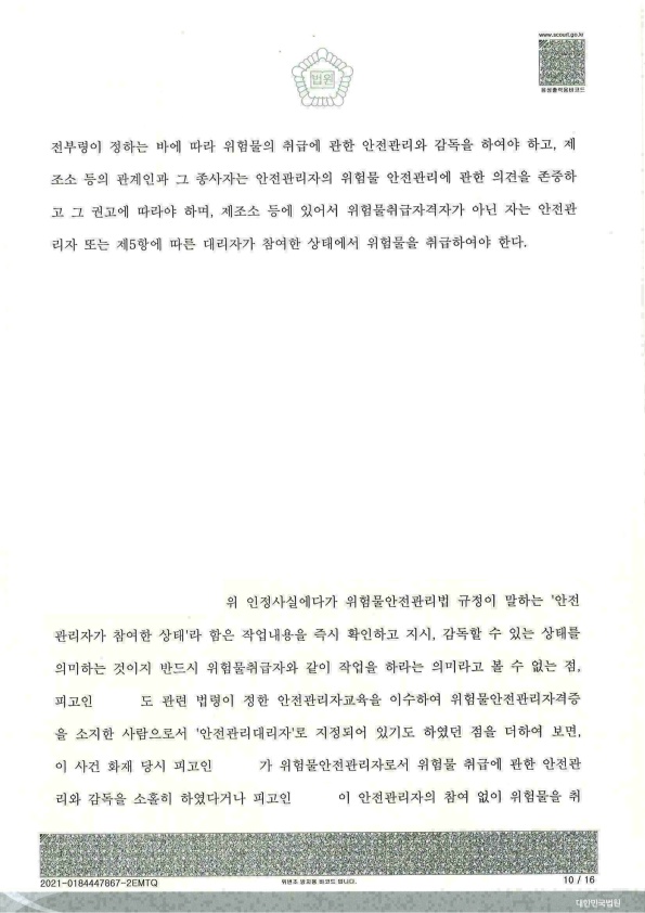 3. 본 변호사는 의뢰인을 위하여, a) 이 사건 화재가 ‘정전기’로 인하여 발생하였다는 공소사실의 대전제를 사실로 단정할 수 없는 점, b) ① 공소사실이 언급하는 이른바 취급시설 ‘부적합’ 판정 전후의 구체적 경위 면면에 비추어 OO공장이 당시 부적법한 행위를 하였다고 볼 수 없고 달리 비난가능성이 없는 점, ② 위험물안전관리법 제15조 제7항 등 규정의 해석과 제반자료에 드러난 사실관계에 비추어 의뢰인은 작업 시 안전관리자의 ‘참여’하에 있었다고 봄이 상당한 점 및 의뢰인은 같은 규정에 의거 작업시 안전관리자의 참여를 필수적으로 요하는 자가 아니기도 한 점, ③ 의뢰인이 정전기 방지의무를 준수하지 않았다는 점에 관한 증거는 없는 점, ④ 의뢰인이 당시 사용한 용기의 사양이나 및 뚜껑을 닫지 않았던 사정 등의 구체적 경위를 살펴보면 관련 사정에는 부적법 소지가 없을 뿐 아니라 공소사실은 사실상 실행불능인 작위를 의무로 상정하고 있는 점 및 오히려 관련 사정으로써 의뢰인이 화재방지를 위해 노력하였음을 추단할 수 있는 점, ⑤ OO공장이 사건 당시 혹은 상시 공장외부에 폐기물 보관통을 위법하게 ‘적치’하여 둔 사실은 부존재한 점 등을 적극 주장 · 증명하며 공소사실이 지적한 의뢰인의 업무상 주의의무의 부담사실 및 그 위반사실을 각 부인하였고, 3) 위 1)의 주장을 받아들이는 이상 이 사건 화재의 원인은 불명인 것이고, 그렇다면 의뢰인의 그 어떤 특정한 작위 또는 부작위와 이 사건 화재 발생 간 상당인과관계가 있다는 판단 역시 불능인 실정임을 각 강변하였음