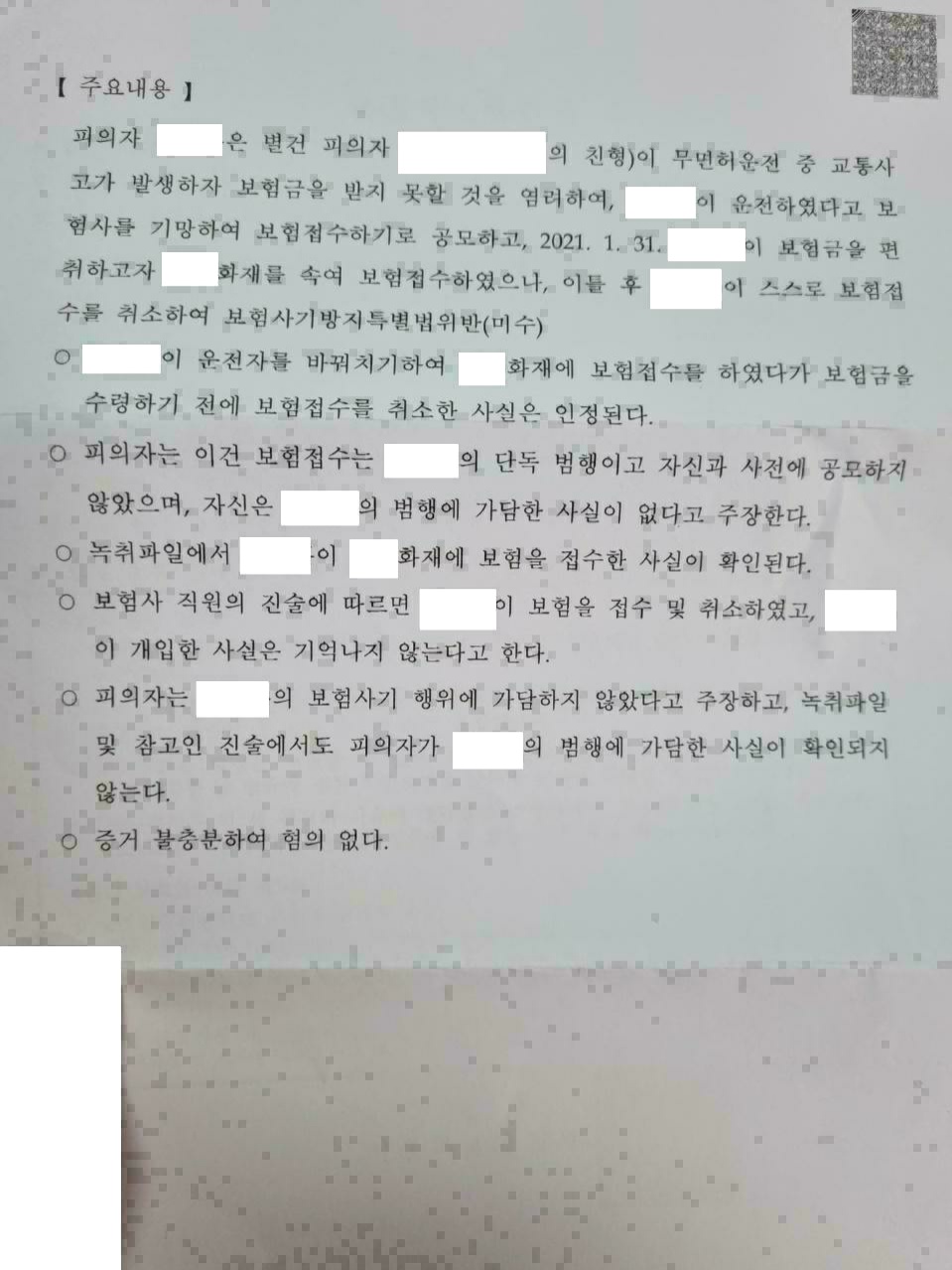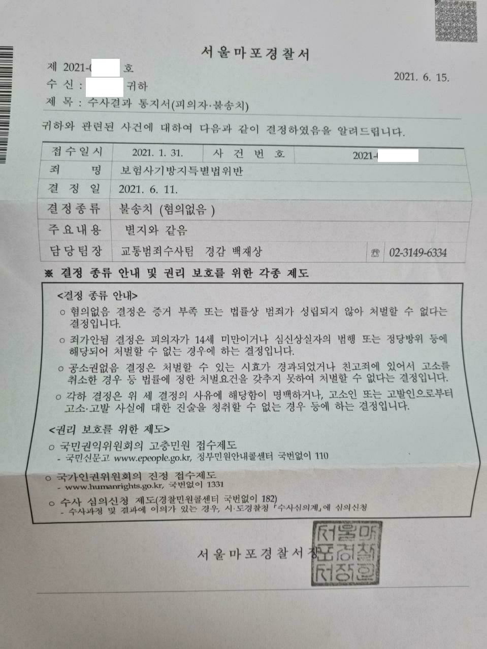 [형사-보험사기] 보험사기방지특별법위반혐의 불송치결정 사례